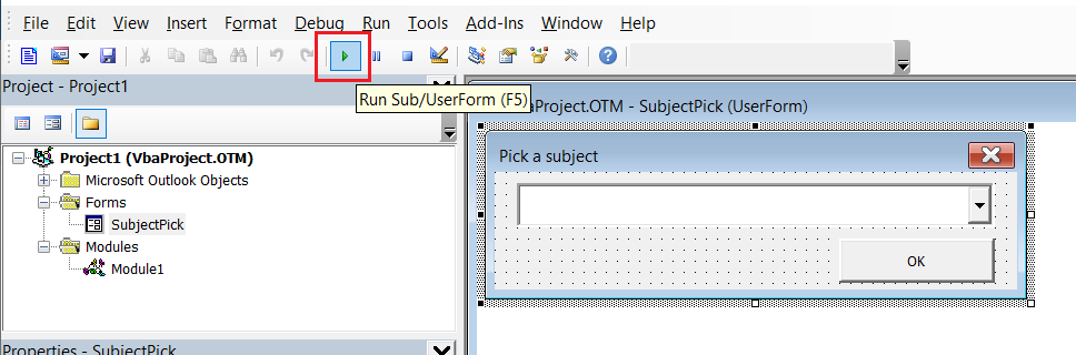 | Caption | Pick a subject | This will set a name on the top of the window that will be seen when user form is run in the outlook |