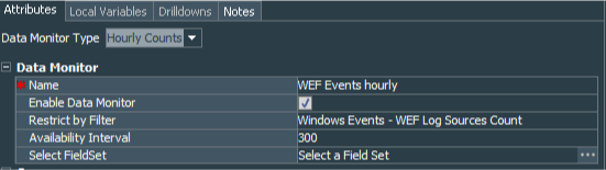 The first data monitor called WEF Events Hourly. It is Hourly Counts type. Simply define our base Windows Events - WEF Log sources count filter in the Restrict by Filter field, set Availability Interval to 300 seconds, and enable it.